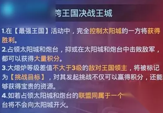 3.如攻方获胜,占领王城的联盟盟主可将自己或盟友任命为两个王国共同的【至高执政官】,战败方本轮的执政官将空缺。 4.【跨王国决战王城】中,参与王城及炮台的战斗可获得更多积分。