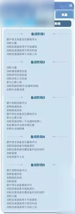 【备战阶段】 1.备战阶段:完成任务可为自己的王国赢得积分。 2.【备战】阶段结束时,总积分较高的王国将获得王国加成;而【跨王国决战王城】将在积分较低的王国疆域内展开。