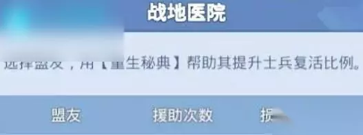 【战地急救阶段】 1.【战争】阶段损失的士兵可被复活,基础复活比例为30%,最高可提升至90%。 2.消耗钻石可购买用于提升复活比例的【复活药剂】每份可提高1%,通过消耗复活药剂最多可提升10%的复活比例。 3.盟友的援助也可提高复活比例,但援助方每次需要消耗一份【重生秘典】。每位领主都拥有20份,每份可为盟友提高1%的复活比例,每个领主最多可以被盟友援助50次。