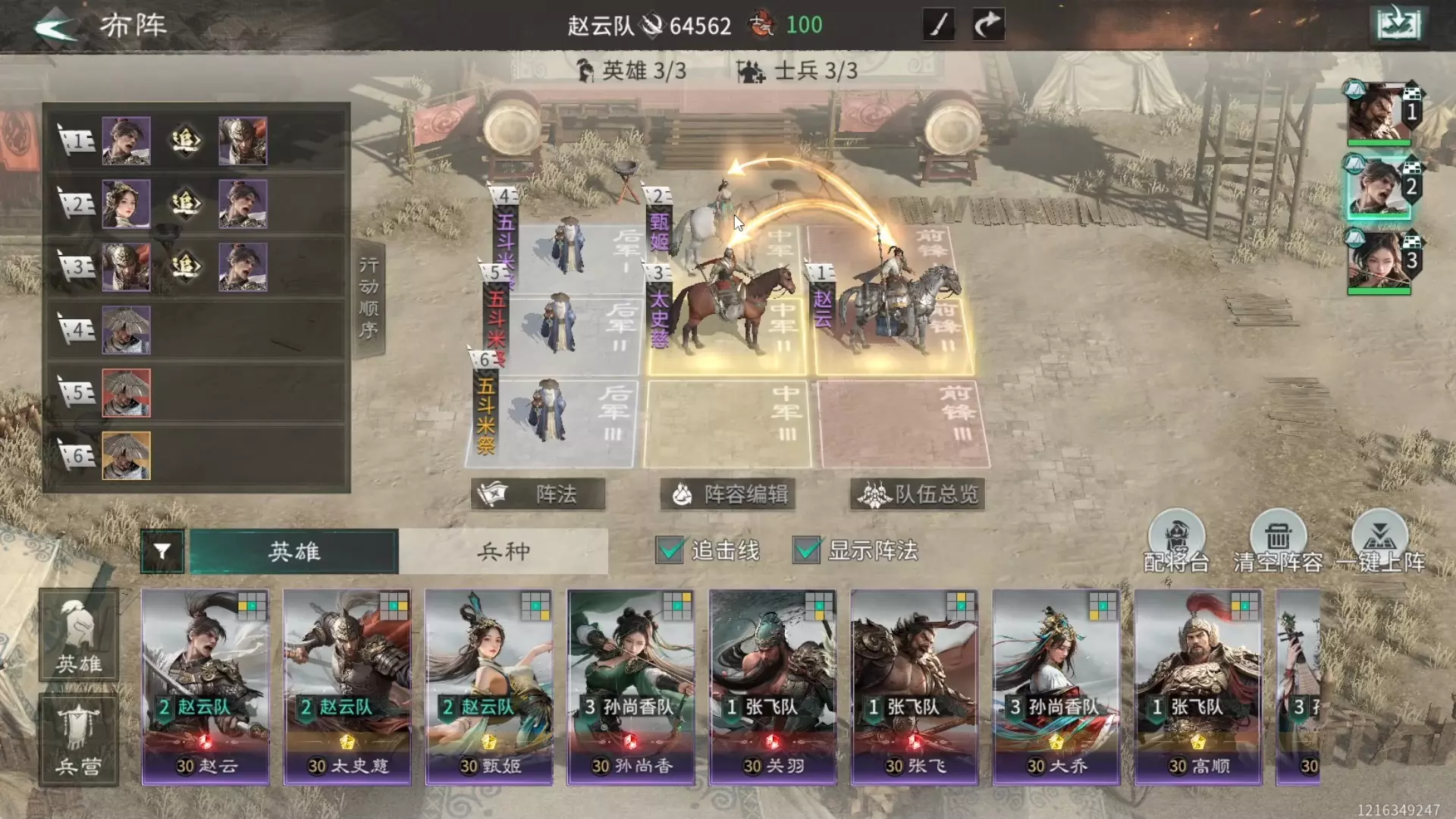 四、飞龙队 1、希尔达和普林姐妹、贝姐和小崔姐弟都有羁绊。 2、贝姐开局减速,盗贼的异常状态技能触发贝姐追击回血,龙骑开始蓄力憋大,盗贼小崔黑猫再动,普林给大姐硬币,希尔达攻击前触发必中然后落地开花。 3、注意由于希尔达的必中只能上两次(2pp),所以普林的硬币最多也只能给两次,所以设置了条件2。 4、这个阵容比较怕格挡,清理重甲的能力欠佳。 五、骑士队:前排末日骑士居中,两侧重骑士,为了提高打击面可以带必中的真实之枪,如果速度够快连飞兵都能打。
