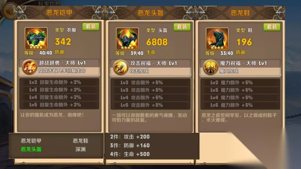 恶龙套防具进阶三个属性分别是:受击回血,攻击加成,魔力加成。且套装属性是直接加成三围方面,加成很直接。武器深渊的技能是眩晕,比较百搭吧。总体来看,恶龙套进攻能力算是中等,防御能力也中等,很中性,比较百搭,可以搭配任何技能,饰品。 近卫套: