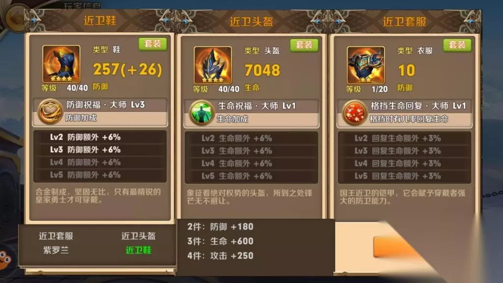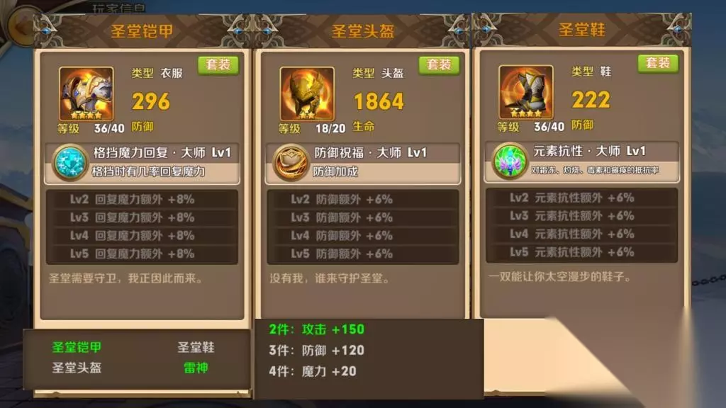 近卫套算是防御类套装。三大进阶属性:防御,生命和格挡回血,这三个属性都是偏向于防御。套装属性和恶龙一样直接加三围,比起恶龙来说,高了一点攻击,少了一点防御,大概是为了平衡这个套装攻击加成太少的关系。装备紫罗兰是辅助技能,提高全队防御。总的来看,近卫套对于防御方面很优秀,适合新手选择,总体搭配方面可以考虑搭配防御类属性的饰品和技能,将防御优势最大化。 圣堂套: