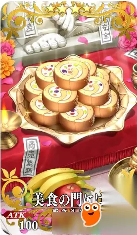 羁绊礼装——在美食之门中 礼装属性 四星 SR ATK100(最大100)HP100(最大100) 技能:伟大的石像神(MoonCancer)装备时,付与自身每回合获得8个暴击星的状态 + 且自身在场时,己方全体每回合HP回复300