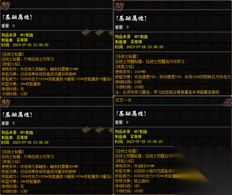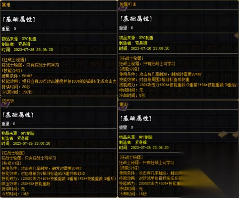 狂战士 一个以高攻速为主的战士 初始职业被动 攻击力加成+100% HP加成+50% 攻击速度+15 10%几率将受到的伤害转化为自身攻击力 每次攻击可为自身增加1%致命伤害,持续60秒,无限叠加。 初始职业技能 基础战士技能:基本、攻杀、刺杀、半月、野蛮、烈火、逐日、开天 暴走:BUFF技能,使用后攻击速度+30并将防御转化为攻击力,持续20秒,冷却150秒 嗜血斩:开启后,下一次攻击伤害自身周围,造成120%攻击伤害并吸取25%生命,9重前每重提升20%伤害,9重后每重提升5%伤害,每重提升5%吸血效果,冷却时间8秒。 怒气斩:攻击时有几率对前方直线8格造成120%攻击伤害并吸取25%生命,9重前每重提升10%伤害,9重后每重提升5%伤害,每重提升5%吸血效果,内置冷却时间10秒。 残暴打击:攻击时有几率对自身周围3*3范围造成130%攻击伤害,9重前每重提升30%伤害,9重后每重提升8%伤害,内置冷却时间8秒。 重击:攻击时有几率对身前单体造成200%攻击伤害,9重前每重提升50%伤害,9重后每重提升10%伤害,内置冷却时间16秒。 强击:攻击时有几率对身前单体造成150%攻击伤害并吸取3%蓝量,9重前每重提升20%伤害,9重后每重提升5%伤害,每重提升3%吸蓝效果,内置冷却时间12秒。