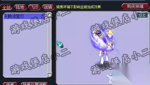 《梦幻西游》九色鹿祥瑞怎么获得 1、直接去商店进行购买便可,商店的位置在宝象国(57,25)桃源仙子处。 2、九色鹿祥瑞介绍:鹿有九色,光耀三界。呦呦婉转,声声吉祥。三界寻侠客,拳拳爱心护,将爱与美带给每一个人。英雄侠士若得之相伴,修行路上更可事半功倍一日千里。 3、特殊说明:集齐5只以上的九色鹿,可以开启九色鹿自动换色效果。 4、技能:飞行; 5、乘坐人数:1人; 6、所需仙玉:1800;