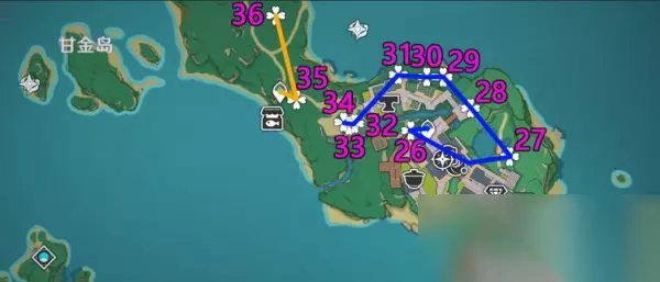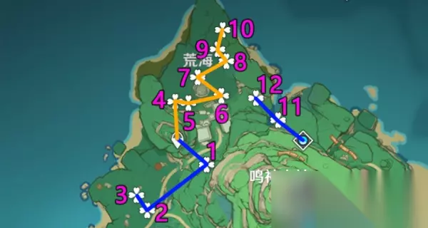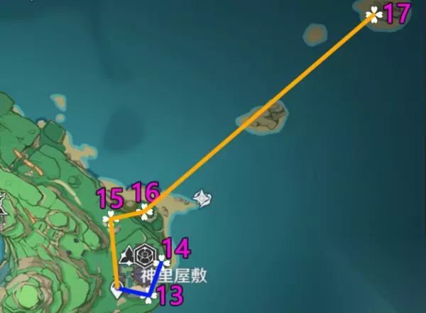 PS:这里关键是13-14点位中间有个雷樱树激活雷种子可以快速到对岸拿绣球;17点位的话没有神里/莫娜直接放弃,不推荐开船硬拿(除非你就缺1-2个可以考虑), 3、「镇守之森」