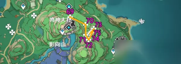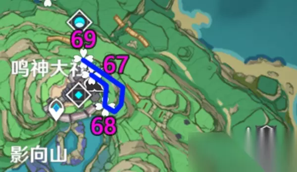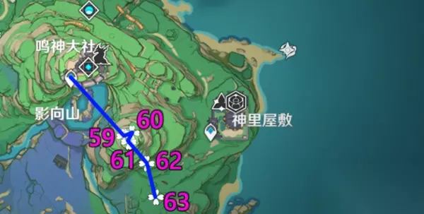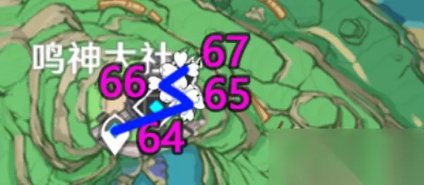 PS:这里有万叶/温迪的小伙伴可以在飞之前可以先垫高一些,省的你多花几秒爬山;注意下61点位是在山顶(可能会卡视角); 8、「鸣神大社神樱书-神里屋敷左上山顶」 路线1(64-67):