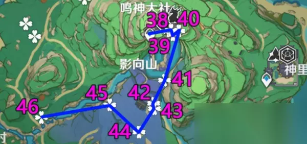 PS:32这里说明一下,是在大樱花树的树杈上;需要往树上爬,可能有的小伙伴看不清楚,这里特别讲解下;34-35这里如果你切图会卡进度条的话推荐直接用早柚跑到35节约时间; 5、「鸣神大社右-影向山下」