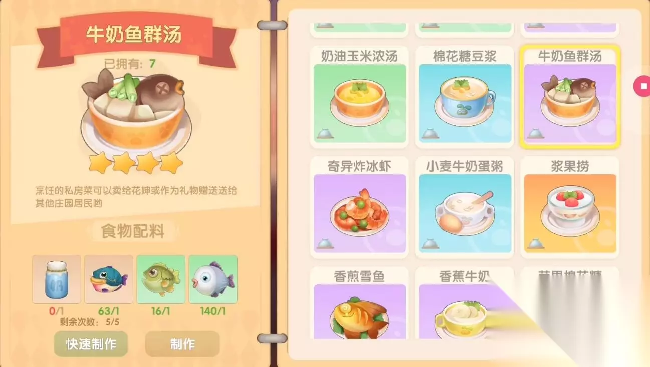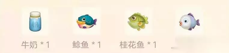【摩尔庄园食谱图鉴大全】 摩尔庄园手游牛奶鱼群汤食谱 食谱配方:牛奶*1、鲶鱼*1、桂花鱼*1、胖头鱼*1 稀有度:4星
