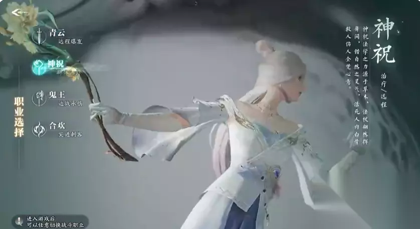 二、职业分析 对于萌新,其实鬼王或者神祝会是更加合适的选择,比较强力,鬼王的容错很高,神祝能更快的提升熟练度。如果是具有一定操作手法,青云和合欢是比较合适的,青云控场上限高,合欢使用中的收益很高,带来高爆发能力非常的激爽。 从目前版本来说,副本的趋势比较明显的,不管是神祝的治疗,还是鬼王的控场,都是高成本的刚需;PVP里面,合欢切后排带来的收益根据分段逐步提升,中高端的作用非常突出。