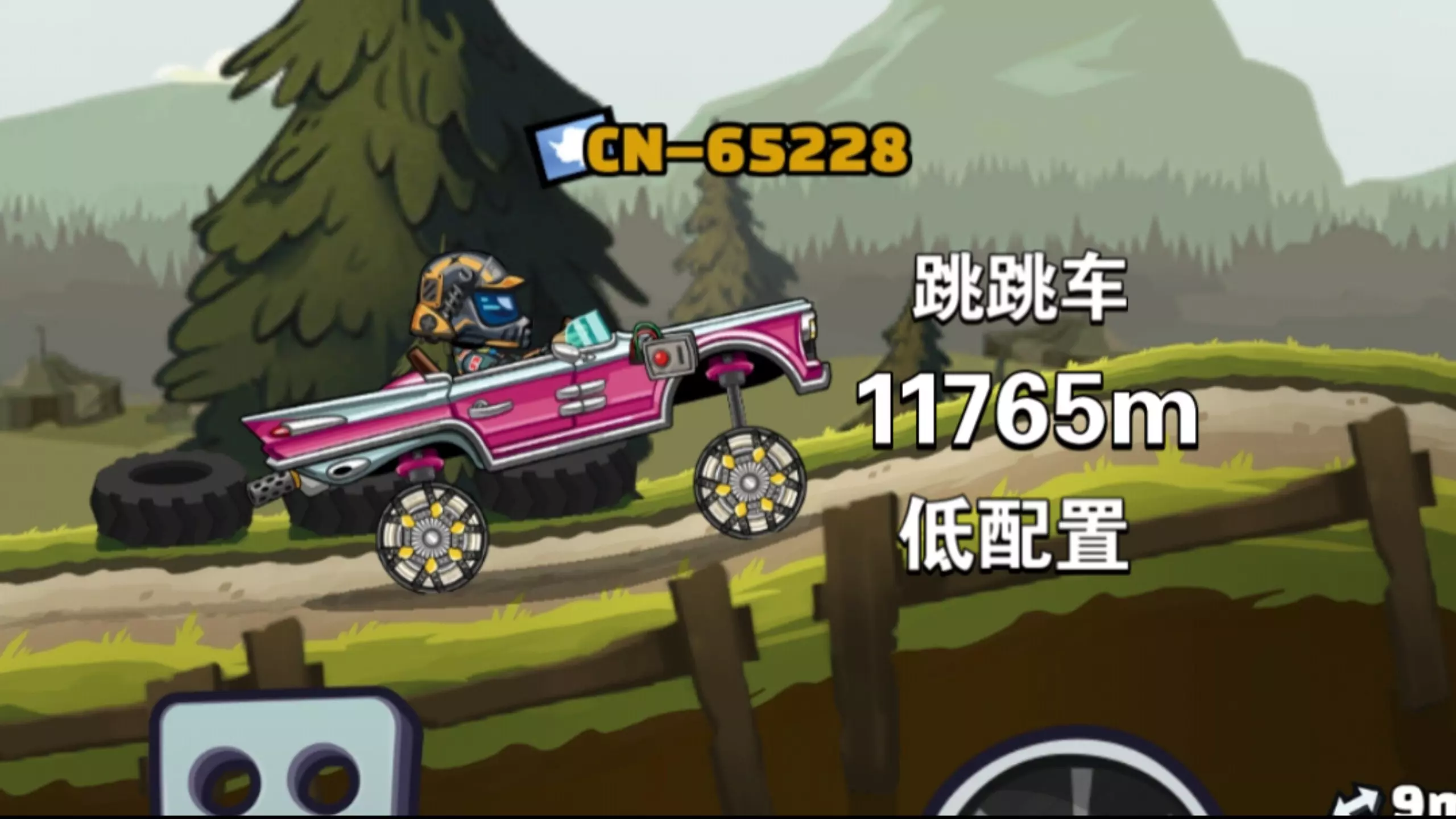这是《登山赛车2》矿山关卡的半教程内容,展示了用跳跳车跑出9980m+的成绩,提到过冲六金币三、翅膀满级的配置,还说明带低燃也能过7000m但难度很高。