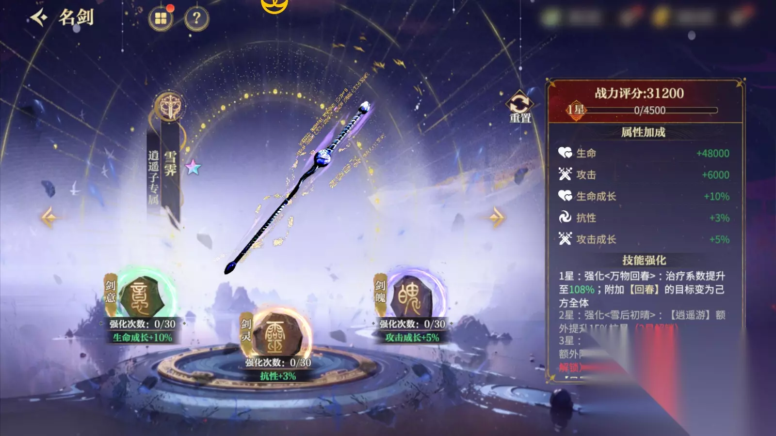 【雪霁】 雪霁原本是道家历代掌门人的信物,自从三百年前,道家分裂为天宗与人宗后,约定每五年比试一次,胜者才可执掌雪霁。如今,雪霁乃是人宗掌门逍遥子的佩剑。