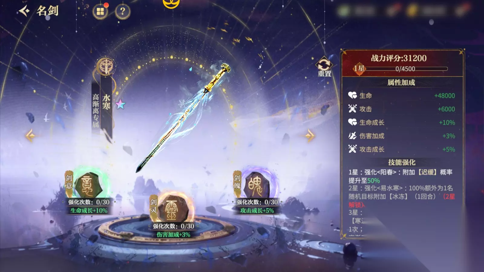 【水寒】 墨家统领高渐离的佩剑,系墨家统领徐夫子所铸。此剑以高渐离的大哥荆轲的诗句“风萧萧兮易水寒”命名。水寒剑剑风轻盈灵敏,剑身纤长锋锐,能够发出寒气甚至结冰。