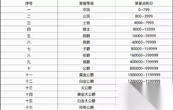 qq飞车荣誉点等级表2023一览 一、平民:0 二、公民:800 三、士官:4000 四、骑士:8000 五、勋爵:16000 六、男爵:40000 七、子爵:80000 八、伯爵:160000 九、侯爵:400000 十、公爵:800000 十一、黄金公爵:1000000 十二、白金公爵:1200000 十三、大公爵:1600000 十四、黄金大公爵:2000000 十五、白金大公爵:2600000 十六、传奇公爵:3000000 十七、传奇大公爵Ⅰ:5000000 十八、传奇大公爵Ⅱ:8000000 十九、传奇大公爵Ⅲ:12000000 二十、传奇大公爵Ⅳ:16000000 二十一、传奇大公爵Ⅴ:20000000 二十二、亲王:2~11名 二十三、国王:第一名