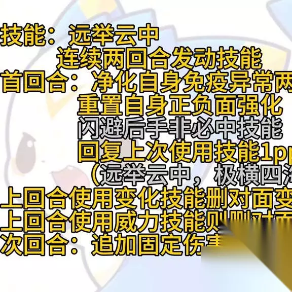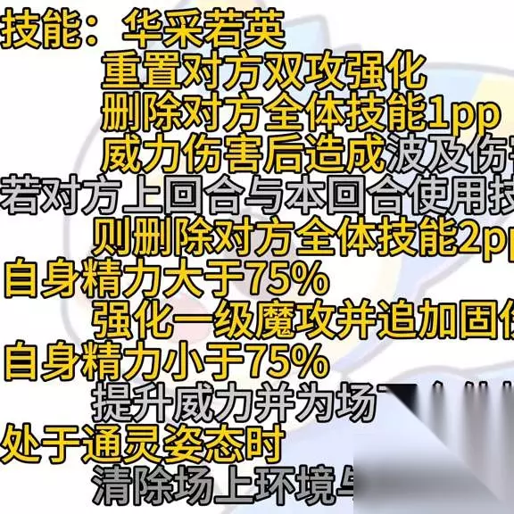 处于通灵形态时,清除场上环境和天气(最多三次)。技能:极横四海。若对方免疫控制类异常,删除对方上回合使用技能3pp,重置自身其他技能4pp。若对方不免疫控制类异常,删除对方本回合使用类型技能4pp,重置自身魔攻等级,提高技能威力伤害。将魔攻等级设为一级,并增加固定伤害。