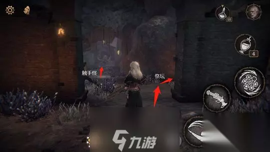 来到堵门小丑的广场,出门左拐,小巷直走是触手怪,右侧山洞里是祭坛。