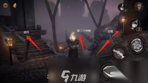 注:此处左侧亭子取道具;直走前往第三个钟楼;右侧沿墙壁探索,可开启伊琳娜附近的宝箱。