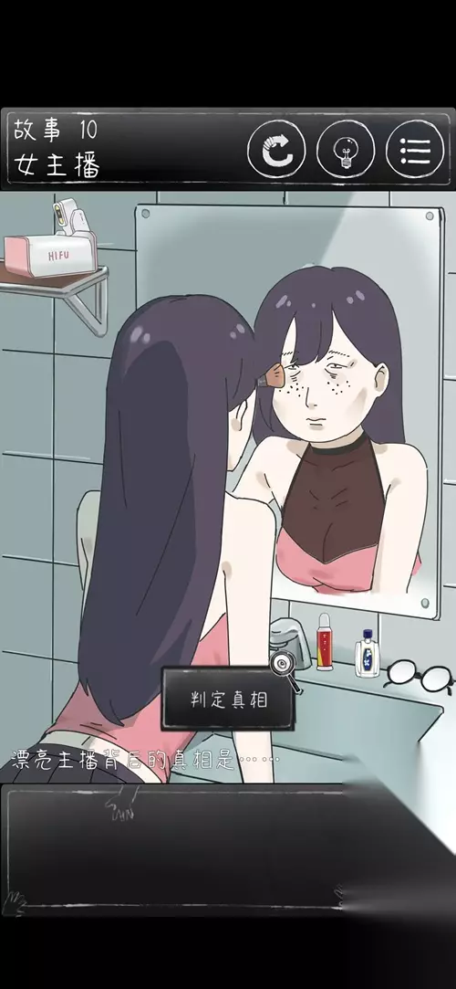 过关步骤: 1.打开柜子取得HIFU机和白花油,桌子上取得药水,眼镜。 2.先将这四个道具摆放好.,然后再点击镜子,最后判定。 真结局: 找到的那些东西都放到洗手间里,然后擦镜子 不普通结局: 直接擦镜子,成就是天生丽质 玩家评论: 这款游戏总得来说还是非常不错的,一些转折啊,细节啊都做得不错,在游戏内容中也讲述了某些社会的阴暗面,虽然主体是要让人细思极恐,但也让人不禁思考人性。 给四星主要是因为这游戏有几个bug(比如女主播的哪一关有一个场所明明主角去了厕所,我重玩之后跳过剧情主角就还在,让人感觉怪怪的,希望可以改进 游戏本身是有广告的,但毕竟人家也是要恰饭的,怎么可能人家辛辛苦苦开发出来就让你白嫖吧,请某些人体谅一下人家。 最后希望之后可以加更多的关卡,我这种猎奇爱好者最爱了~(≧▽≦)/~加油鸭>3< 玩家评论: 这款游戏总得来说还是非常不错的,一些转折啊,细节啊都做得不错,在游戏内容中也讲述了某些社会的阴暗面,虽然主体是要让人细思极恐,但也让人不禁思考人性。 给四星主要是因为这游戏有几个bug(比如女主播的哪一关有一个场所明明主角去了厕所,我重玩之后跳过剧情主角就还在,让人感觉怪怪的,希望可以改进 游戏本身是有广告的,但毕竟人家也是要恰饭的,怎么可能人家辛辛苦苦开发出来就让你白嫖吧,请某些人体谅一下人家。 最后希望之后可以加更多的关卡,我这种猎奇爱好者最爱了~(≧▽≦)/~加油鸭>3<