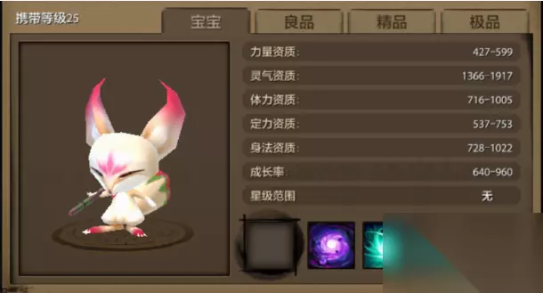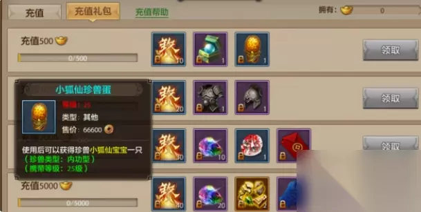 天龙八部小狐仙怎么获得 获得方法: 在游戏中,玩家可以通过购买首充礼包来获得一只小狐仙。 商城中有500元宝的礼包,购买后可以获得第二只小狐仙。 如果玩家愿意再充值50元,可以再获得一只小狐仙。有了这些小狐仙,玩家可以进行繁殖,生成二代珍兽。 如果两只小狐仙的完美成长率得到保证,那么它们繁殖出来的二代珍兽可能拥有4到9星的资质。 资质优异的小狐仙可以陪伴玩家到65级,对于新手玩家来说,它们是非常实用的宝宝。 然而,到了游戏后期,小狐仙的资质可能就比不上大多数珍兽了。