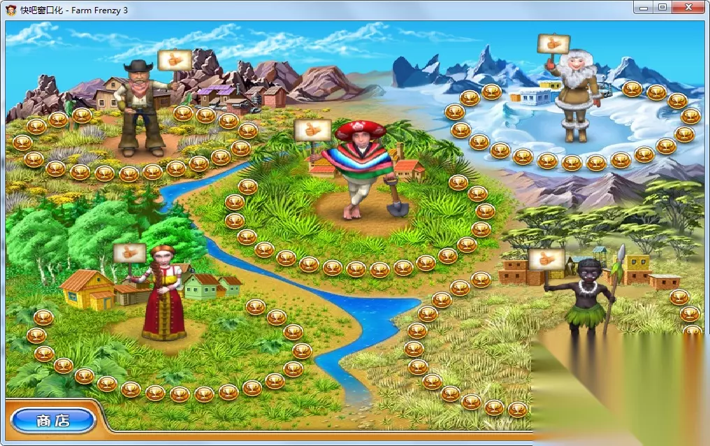 游戏里还有各式各样的成就挑战,让精通游戏的玩家具有更大的挑战性,以及持久性。 《疯狂农场3》五大农场 这游戏分五个区域,分别代表了 戴夫农场:这是借鉴了美国牛仔风格的人物标志,游戏里主要完成的程度以制造各种各样的烹饪糕点为主,从开始的,养,鸡,羊,牛,分别生出,鸡蛋,羊毛,牛奶。 玛利亚农场:这里是借鉴了欧洲的英法风格的性感女性标志,这关游戏生产以鹅蛋,耗牛毛,奶牛生产的牛奶为主。 帕布罗农场:这关是借鉴西班牙风格的人物装束,生产鸡蛋,骆驼,羊角,以做服装为主。 法尼农场:这里代表的是南极,最形象的就是冰雪画风,而且游戏产出以企鹅蛋,皇室企鹅羽毛,和海象牙齿。 莫里斯农场:以非洲黑人为形象,生产的以珍珠鸡蛋,鸵鸟蛋水牛奶。 从画质上去了解,看的出来人物的造型,和里面动植物很形象,并且建筑物,各种工厂机器工具,以及飞机三轮车,到火车,都很形象。构造上也有一定的讲究。