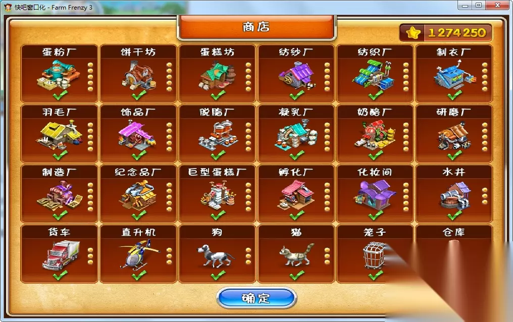游戏里还有商场,里面分 蛋糕行业设备:饼干坊,蛋糕坊,巨型蛋糕厂 服装行业设备:纺纱厂,纺织厂,制衣厂,饰品厂 奶酪行业设备:奶脱脂厂,凝乳厂,奶酪厂 以及工艺品行业设备:纪念品场,化妆间。 每一种建筑都对应其应有的作用,让整体游戏具有更加的体验感,和顺畅感。 并且提升仓库能增大容量,提升笼子能加强关捕野生动物强度,升级机车可以增加买卖时间,以及直升机等。