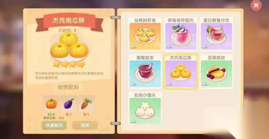 要制作杰克南瓜酥,首先要确保厨师等级达到6级。达到等级后,就可以在餐厅的烹饪界面找到对应的配方。食材搭配方面,需要南瓜、胡萝卜和茄子三种蔬菜和小麦,推荐比例为南瓜4个、茄子5个、胡萝卜3个、小麦1个。食材获取方面,所有基础材料都能通过梅森种子商店解决。南瓜、茄子、胡萝卜种子建议在阳光充足的白天播种,成熟周期约24小时,记得提前规划种植时间。小麦种子则需在梅森处购买后,在农场的耕地里种植。