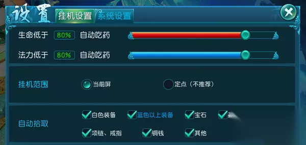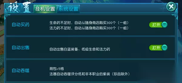【挂机设置】 1. 挂机前要设置好相应的挂机设置,挂机设置玩家可以在“设置”→“挂机设置”中进行。