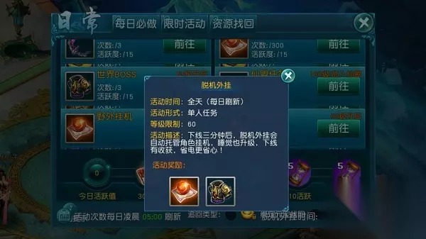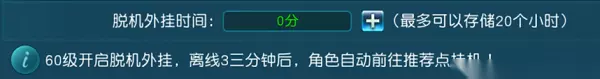 【脱机外挂说明】 1. 活动时间:全天(每日刷新) 2. 活动形式:单人任务 3. 活动奖励:经验、极品装备等 【系统介绍】 1. 玩家等级达到60级即可开启离线挂机系统 2. 在玩家离线3分钟后,角色会自动前往推荐点挂机 3. 离线挂机需要挂机时间,最多只能储备20小时