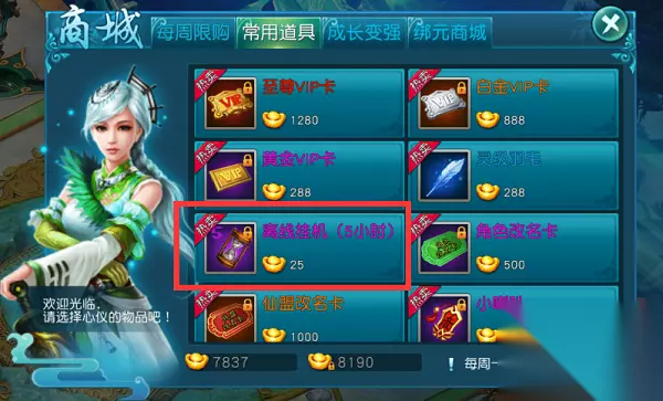 3) 也可以直接去商城购买,25元宝即可获得1张5小时的挂机外挂时间
