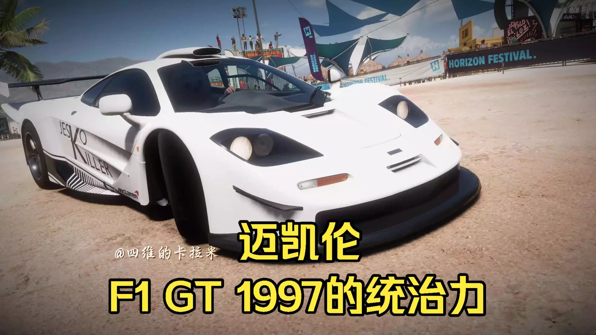 《极限竞速:地平线5》的萌新玩家分享抽奖收获,抽到了自己在游戏里的第一辆传奇车——1997年迈凯伦F1 GT,还展示了驾驶该车辆在游戏地图中行驶的画面。