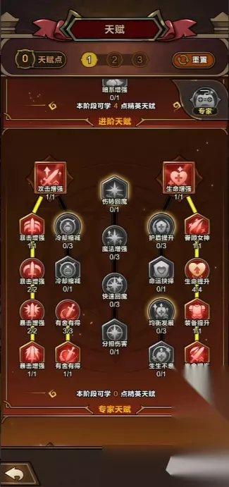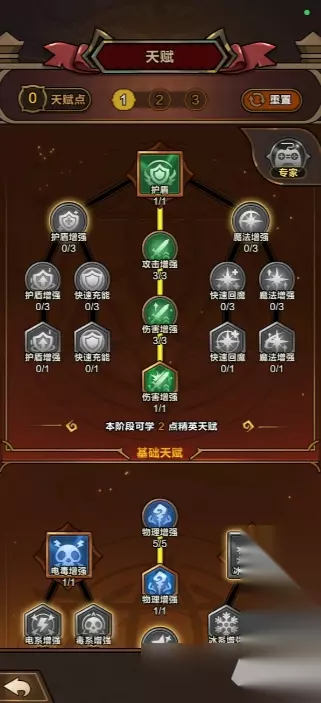 攻击类天赋(优先): 伤害提升: 直接增加所有伤害。 暴击率: 提高触发暴击的几率。 暴击伤害: 让暴击的收益更高。 生存与辅助(次点): 血量提升: 保证不被小怪或BOSS技能秒杀。 技能伤害/普攻伤害: 由于我们是“魔法弹普攻流”,这两项都能直接提升核心输出。