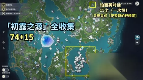 收集注 意 1、若没做完任务【水仙的踪迹】的旅行者跟着路线走是拿不到74个初露之源的,不过跟着路线走也是可以拿到50多个初露之源。 2、完成任务【伊黎耶的野精灵】可兑换15个初露之源。 2、队伍可携带双风、那维莱特、四风原典等减少采集时间。 3、林尼固有天赋可以让枫丹特产显示出来,有的尽量带上。 4、光看图可能分不清等高线,难分辨初源之露的具体位置,建议跟着 视频走。 地图总览