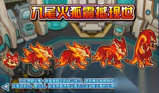 烈焰火狐:福克斯进阶之后是【烈焰火狐】,也是福克斯的高级形态。不过当时因为火狐一族并没有剧情设定,所以它也仅仅单纯的是一只捕猎场稀有精灵,除此以外没有其他的背景设定。直到2012年超进化篇章前置开始之后,它就成了【珀伽索斯】的主线剧情开启者。