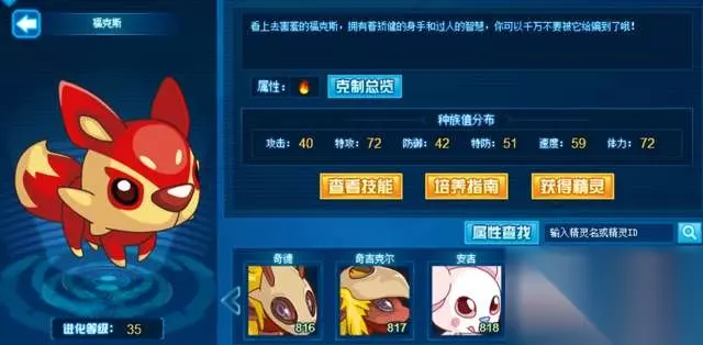 福克斯:2011年7月份登场的精灵,也是当时捕猎场的专属精灵,参假过活动的玩家都应该知道,但如果没有参加过这个活动的,基本上是得不到初阶形态福克斯的。后来有火狐也是火狐超进化的时候送的进阶版高级形态。据说当年这个精灵不好抓,有人甚至使用了200多个胶囊,反正我记得清楚是我一直用中级抓了50-60个左右。