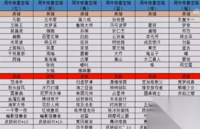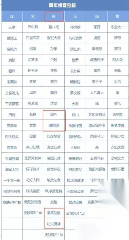 2,通过对比会发现,每种颜色宝箱都是有很多英雄、皮肤以及10个皮肤碎片,同时这些英雄和皮肤都是商城直售皮肤,并没有出现限定皮肤或者是其他免费兑换的皮肤!每个宝箱当中的皮肤大部分是伴生皮肤,高级勇者皮肤,而且也有少数会进入到皮肤碎片商店兑换的史诗皮肤。其中褐色周年惊喜宝箱当中有两款史诗皮肤,夏侯��乘风破浪和程咬金功夫厨神,还有两个18888金币的英雄雅典娜和哪吒。而其他宝箱当中都只有1款史诗皮肤,因此兑换褐色皮肤价值会比较高一些。 六周年宝箱建议选褐色或者是橙色宝箱。 一、褐色宝箱 二、橙色宝箱
