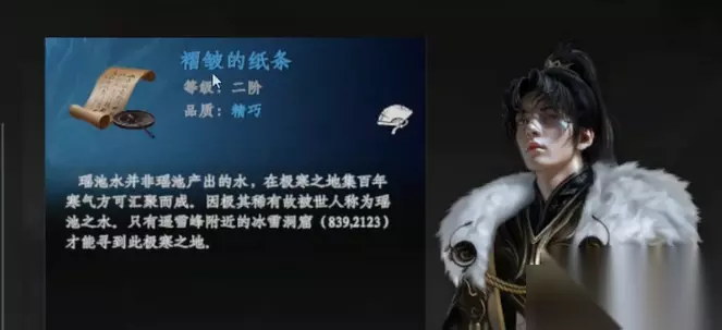 第二种材料是瑶池水,获取此物品的过程相对较为复杂。在你完成“72福地龙脉解迷”的任务后,需要前往云鹤村。此时,村中有一位老人不慎落水,救起她后,她会告知一个坐标(839,2123)。前往此坐标后,你即可获得瑶池水。值得注意的是,若你在游戏前期没有救起这位老人,她将不会出现在水中,这时你可以通过提供50万银两或者施加武力来迫使她透露坐标。