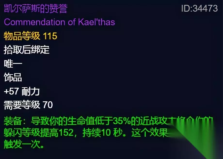 叠加10次也就代表着可以增加440点攻击强度,叠满之后就是开启你爆炸输出的时候,难点就是叠加攻击次数不要消耗太多的资源,特别是猎人,毕竟是用蓝的职业。武器战还有盗贼也需要注意,千万不要把自己的怒气还有能量的循环破坏得太厉害,毕竟要留着打10层叠满之后的输出才行。 “凯尔萨斯的荣誉”+“影月徽记”,这两件装备对于坦克来说非常重要,现在说说前者,当你的生命值低于35%的时候,你的躲闪等级将会提升152点,持续10秒的时间,要注意的就是这个效果30秒才能触发一次。