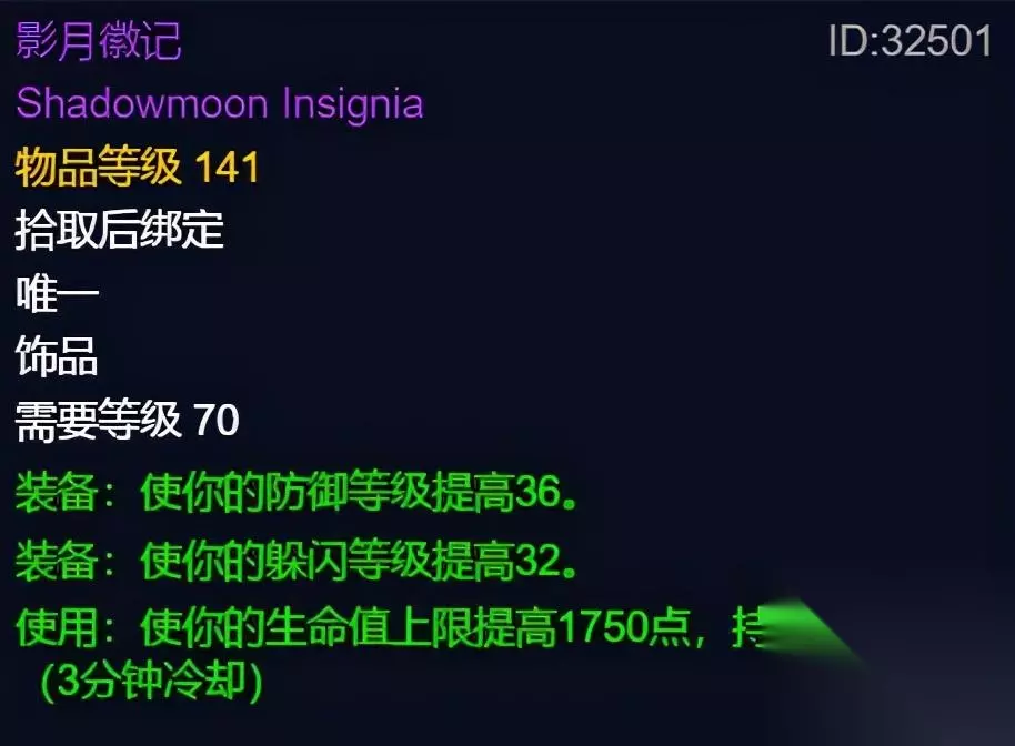 躲闪这个属性在60怀旧服可能不太重要,可是到了TBC躲闪等级就能够帮助你规避很多伤害,必须要堆防御三维才能够让变向的让坦度提升起来。 至于为什么要“影月徽记”,道理就很简单了,首先人家给到了防御等级36点,这是绝对意义上的刚需,随后32点的躲闪等级,算在防御三维中。