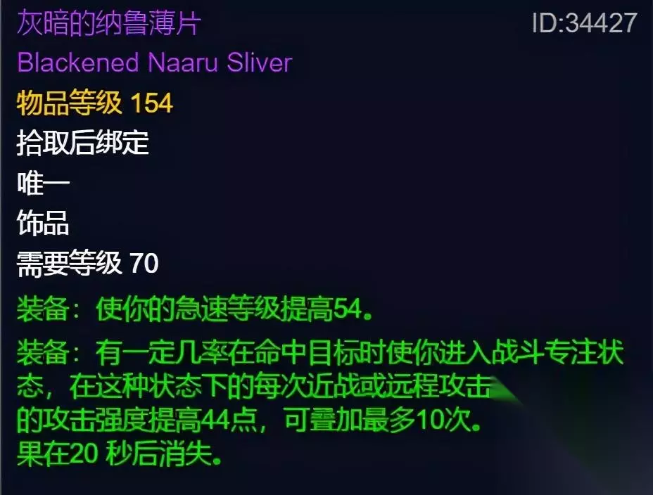 最主要的一点就是在吃了魔法宝石之后,就能够获得一个提升25%的法力值效果,并且在15秒的时间内,你的法术强度会提升225点,这也就是代表着在这15秒内,你的续航能力得到了提升,并且在这个期间之内你还能够有充足的蓝量去大爆发,懂门的朋友就知道这是奥法的神装,作为法师三系里面最耗蓝的职业,续航和爆发是必要的! “灰暗的纳鲁薄片”,这件装备厉害的地方第一就是提升了急速等级,在TBC版本中,急速对于物理职业来说非常重要,其中的原理就是急速提升那么攻击节奏就会提升,输出能力也就越强。