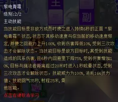 号称物理剑的“第三刀”,伤害与流风相仿,但是命中后可以让对方在3秒内无法切换目标,是击杀冰心的必备技能。 【紫电】