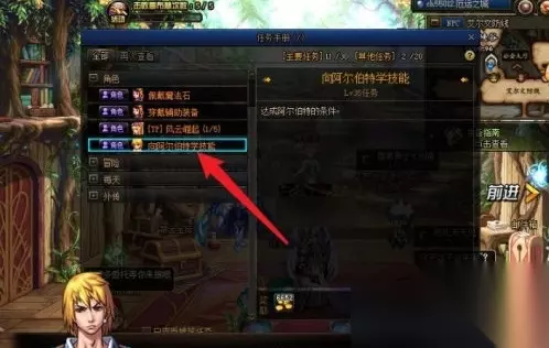 dnf阿尔伯特偷学技能任务图文教程 1、我们进入游戏,开启角色任务手册界面,选择角色任务分类。