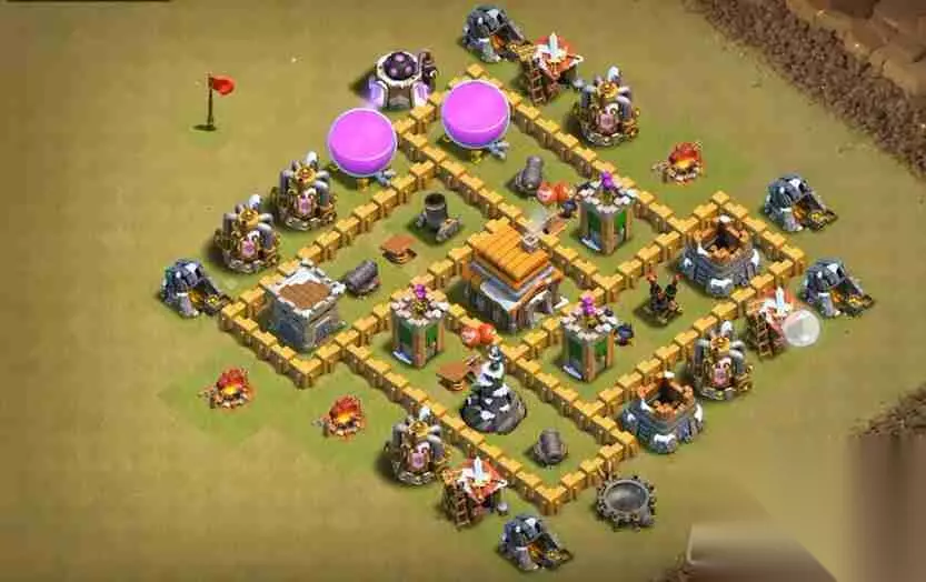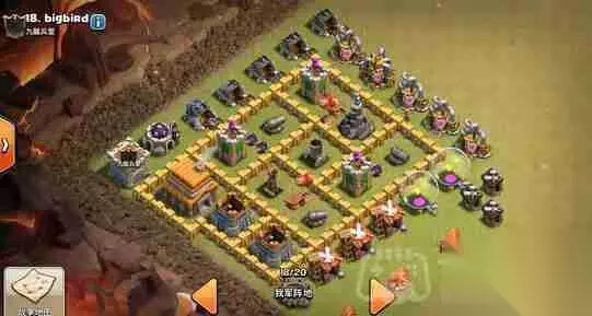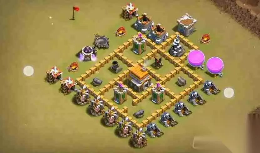 5本经典风车阵:城墙布局分散且连接紧密,最大化利用城墙资源。规则的阵型设计,使陷阱发挥最大效用。外围建筑有效牵制敌人,延长防御建筑的输出时间。