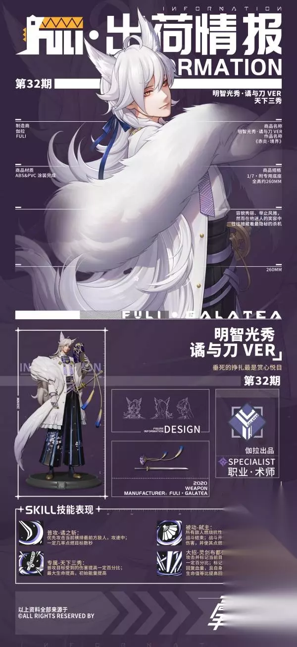 《高能手办团》推出1/7比例的明智光秀·谲与刀VER手办,材质为ABS&PVC涂装完成品,全高约260mm。该手办原型出自《奈央·境界》,还披露了明智光秀的档案、口头禅及技能表现等内容,情报以游戏内为准。