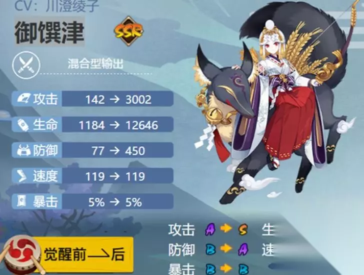 阴阳师御馔津值不值得培养阴阳师御馔津是非常值得培养的,在她的属性面板上,生命是输出SSR式神里最高的,从属性上来看这是个比较肉的输出型式神,大招单体伤害爆炸,叠满加成后伤害极高,每次使用后也会消耗掉所有符咒。强度解析普攻80%伤害,有个类似“反击”特效,有概率对敌方行动后的式神造成普攻伤害外加4种封印效果(同时造成4个debuff,都会被抵抗,单独计算)主动技能的幻境[狐守界],提高1技能特效概率到30%。并增加持续1回合。维持结界期间获得属性加成,每次触发反击获得4张护符,最多12张符咒。大招造成150%的伤害,并引燃符咒,每张额外带来20%御馔津攻击力的伤害。护符数量越多伤害越高。(百鬼弈测试最高打出6W的伤害)