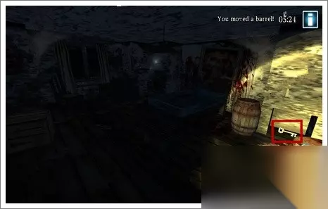 3、移开这两个木桶,有一个暗格,里面有一把钥匙,带走,这是我们获得的第一把钥匙。