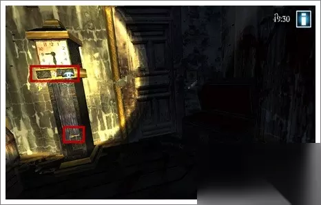 10、来到一楼的时钟,可以看到里面有一把钥匙,按照信中三个时钟图案的刻度,按编号顺序输入,钥匙就会不断往下掉,直到我们可以拿取。时钟下面的两个按钮分别代表时针和分针,这把钥匙不用说了,是开门的钥匙。