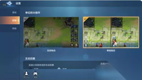 8、快速切换队伍视角 多线操作有时会需要快速切换选中的队伍,虽然在游戏中真正需要多线的机会并不多,但也可以简单介绍一下。 切换选中队伍及其视角可通过单击或者双击队伍来实现,单击是选中队伍,双击可以在选中队伍的同时切到该队伍的视角,这样可以更加方便的完成多线操作。 同时系统提供了残血小兵自动后退的机制,你可以自由选择小兵残血后退的血量,即时战略的经典操作实现了精简化! 但是注意不要忘记移动视角回基地进行建筑建造等运营操作哦!新版本修复了双击建筑按钮无法回到基地位置的bug,这么看来游戏官方十分重视玩家们提的建议的!