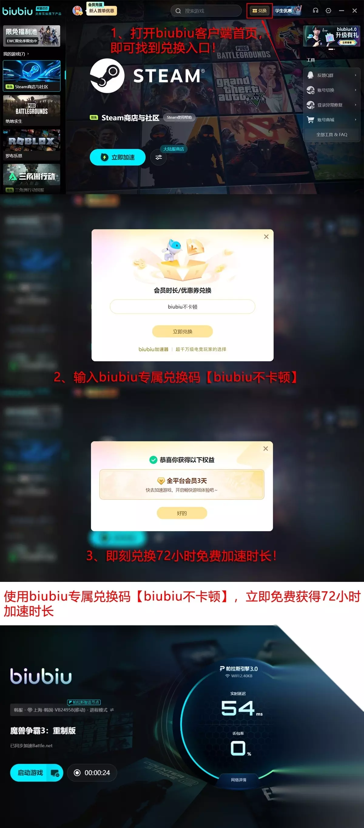 新用户完成首次注册后,即可获赠24小时全功能免费加速时长;所有用户输入兑换口令【biubiu不卡顿】,还可额外领取3天高级服务权限,足以支撑多场标准对战及组队协作场景。