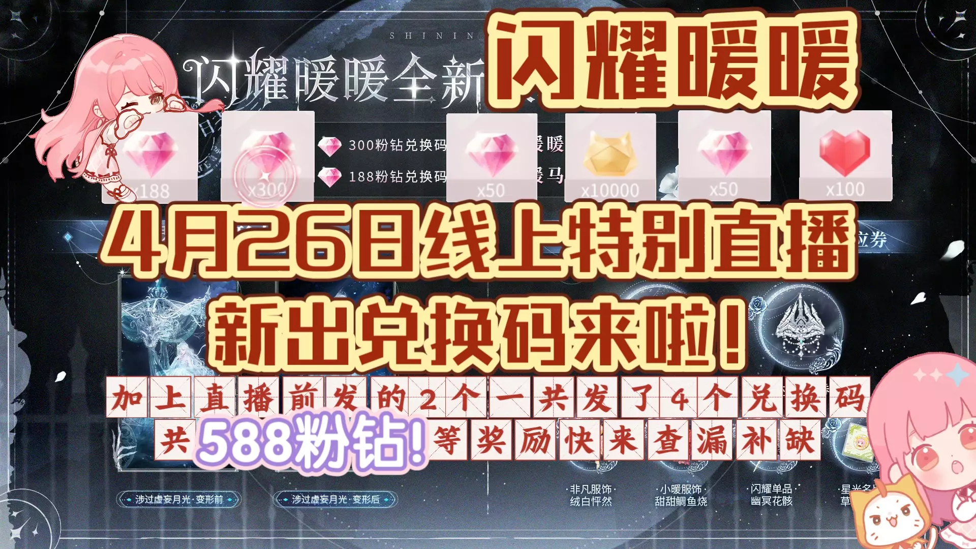 这篇帖子分享了《闪耀暖暖》的最新兑换码“闪暖在逃幽灵公主”,使用该兑换码可领取50粉钻与10000金币,还展示了游戏内输入兑换码领取奖励的操作界面。