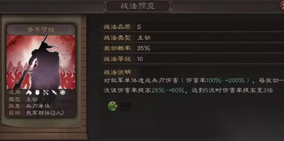 《三国志战略版》势不可挡怎么样 1、势不可挡是主动战法,35%的发动率,对敌军单体造成200%的兵刃伤害,每发动一次该伤害率提高50%,达到5次伤害率提高至3倍 2、简单理解,就是发动5次该技能,伤害率达到600%,单杀的话基本可以秒杀一个武将了 3、除了发动概率35%的话,有点低,一场8回合的话一般发动个3次左右就很不错了,想提高发动概率,白马义从、白眉可以合理的搭配下。